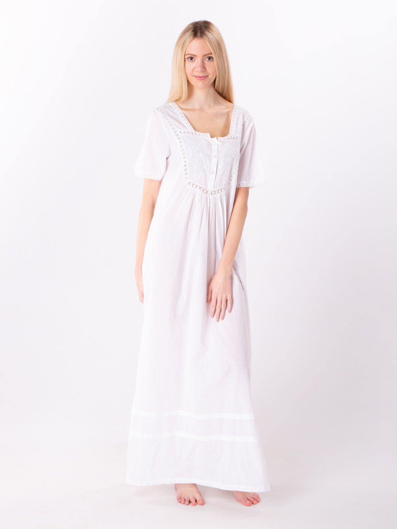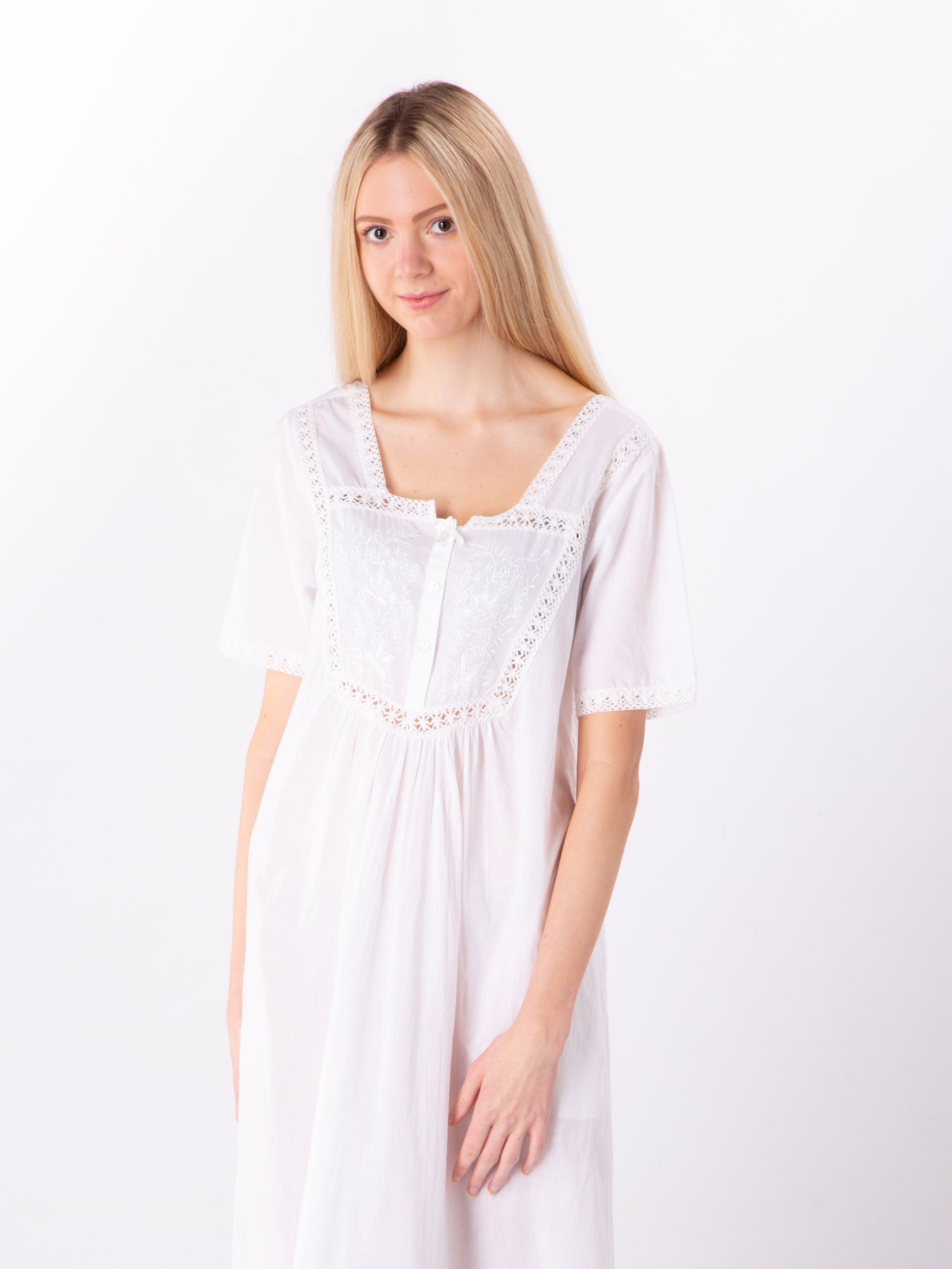 Beautiful white nightgown in a short sleeves. The low back gives this nightdress an elegant finish. Boasting a stunning victorian style embroidery across the chest and a delicate cotton lace. Features a front opening with 4 buttons and a pocket.