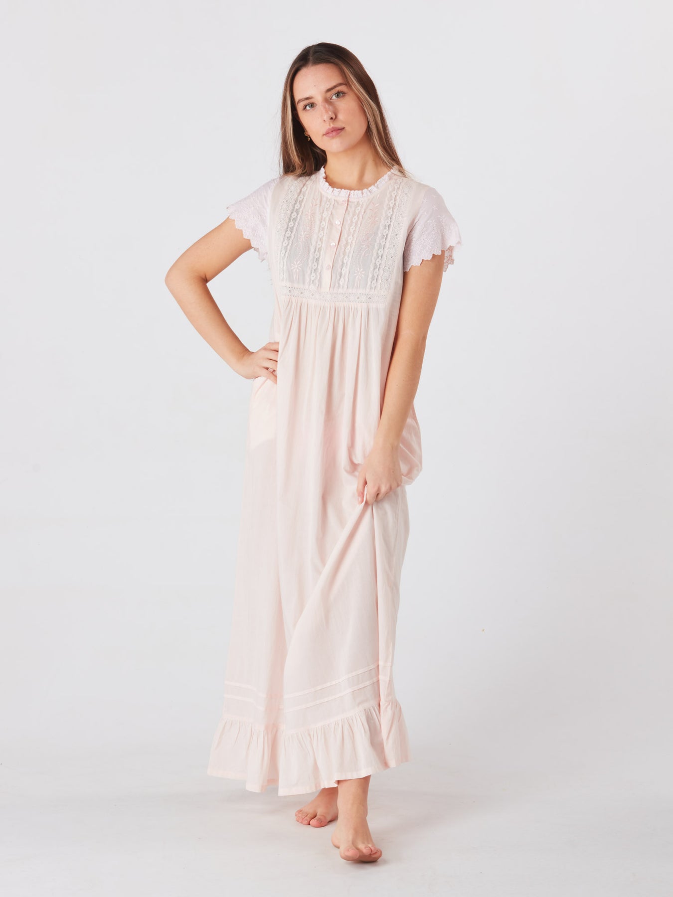 White cotton nightgown in a classic victorian style. Featuring a beautiful embroidery on the neckline and on the sleeves. The 4 button opening makes this a versatile item. This nightdress has the added benefit of pockets. Available in 4 sizes.