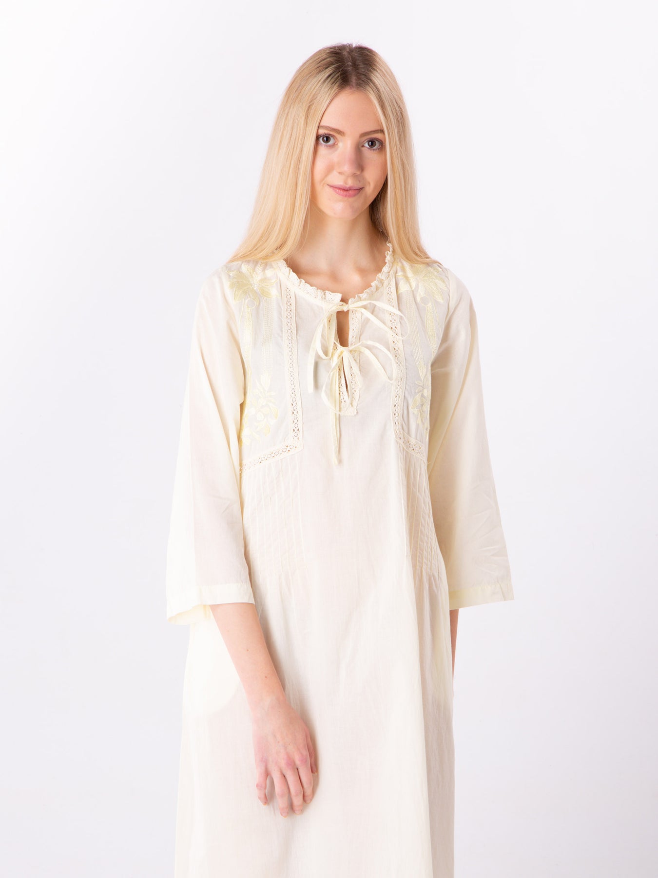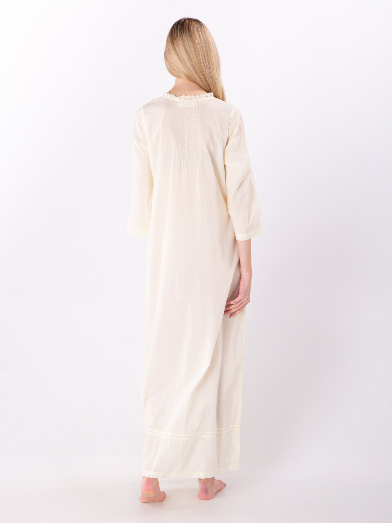 Beautiful nightdress in a 3/4 sleeve, featuring a lace frilled neckline, and ribbon front opening. The hand stitched pin tucking and embroidery add a touch of elegance.