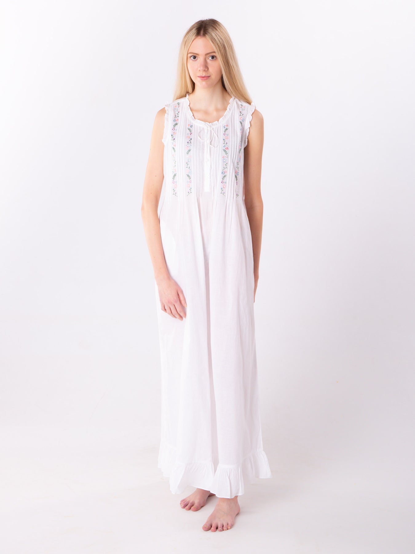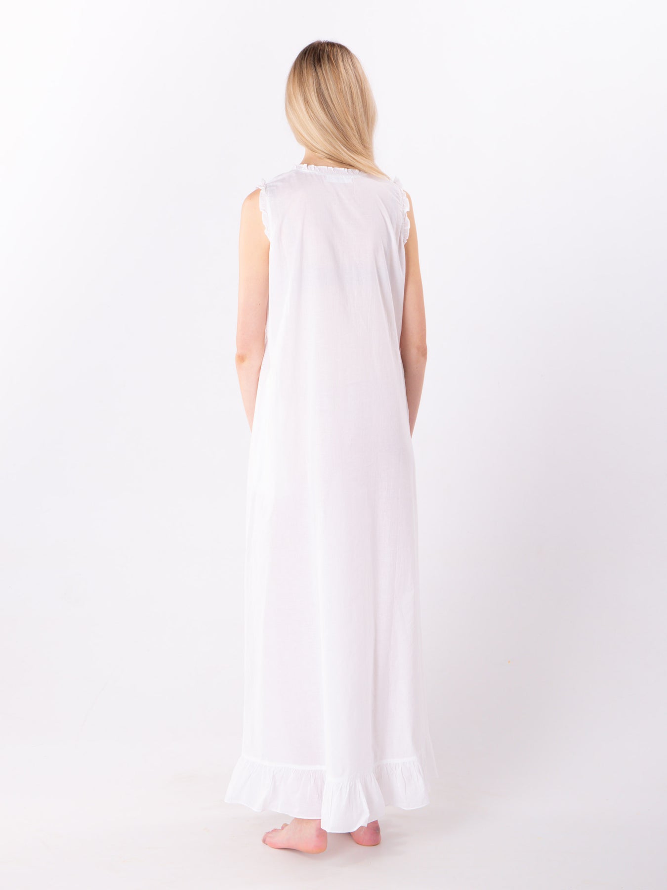 Beautiful sleeveless 100% cotton nightgown featuring a frilled collar. The embroidered pin tucks add a wow factor. Features a front opening with 4 buttons and a pocket. Ideal as a maternity nightdress or for those hot summer nights.