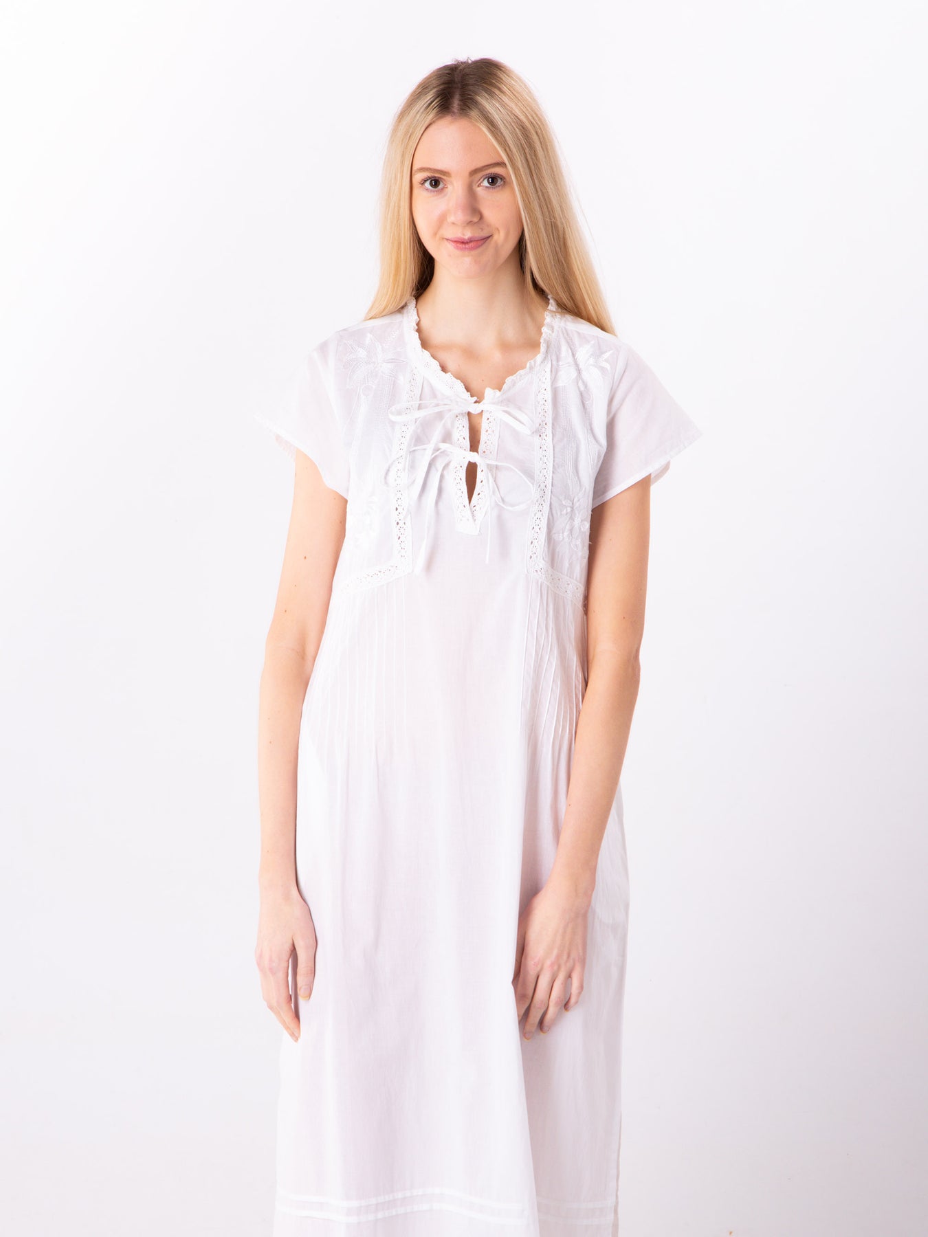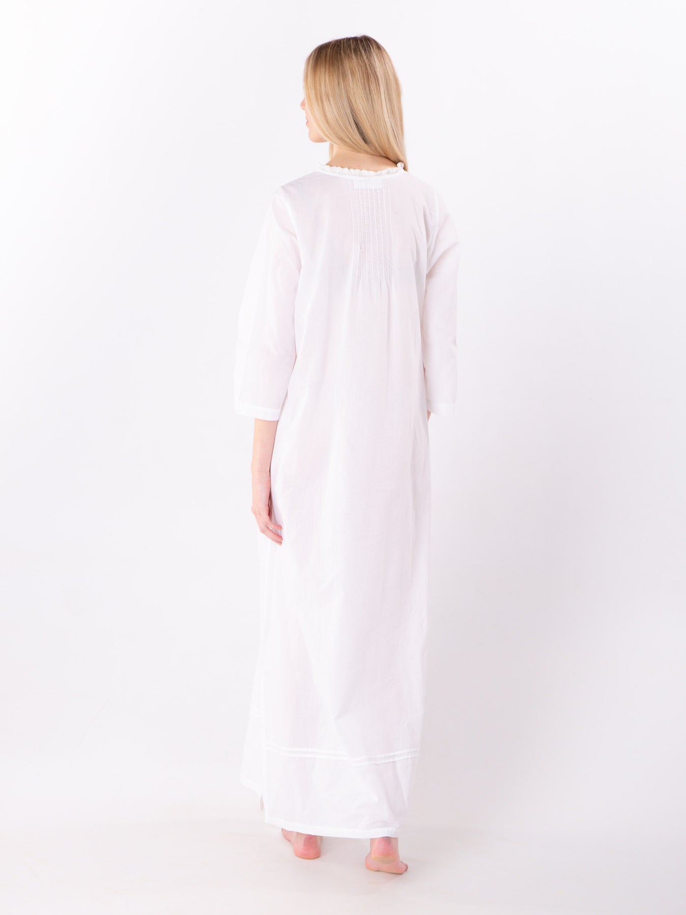 Beautiful nightdress in a 3/4 sleeve, featuring a lace frilled neckline, and ribbon front opening. The hand stitched pin tucking and embroidery add a touch of elegance.