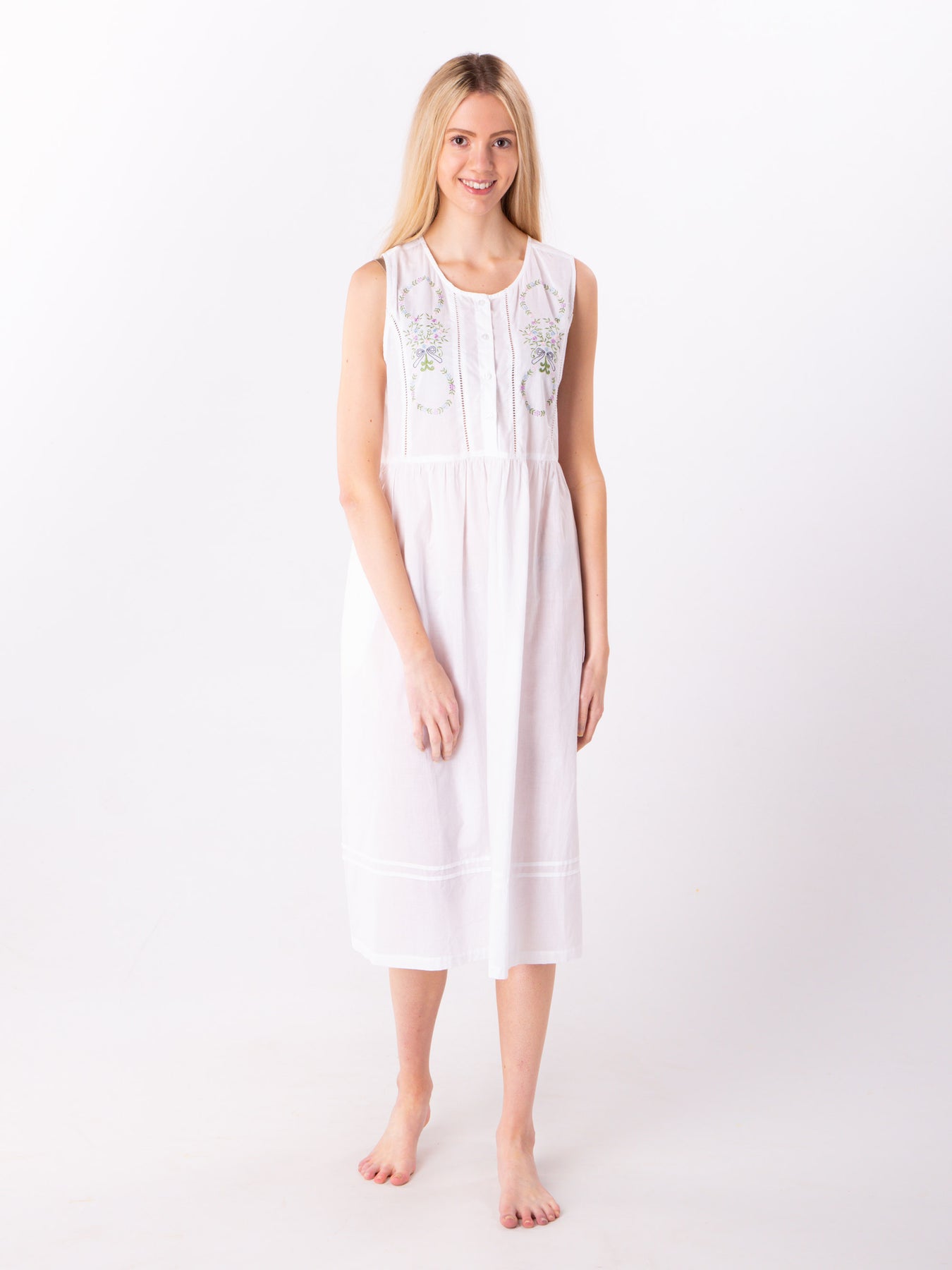 This cotton nightgown boasts a lavish embroidery on the chest, complimented with 4 buttons down the placket. The short sleeves and frilled hem make this the perfect summer addition. A real English classic.
