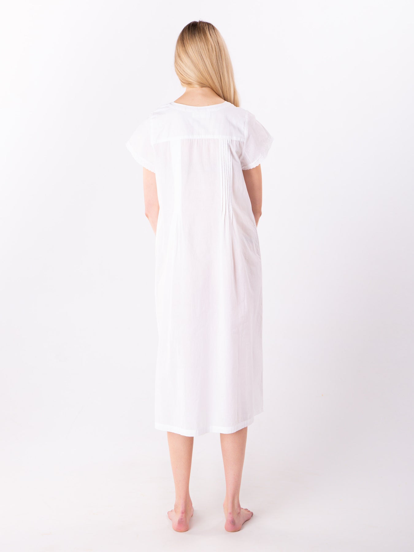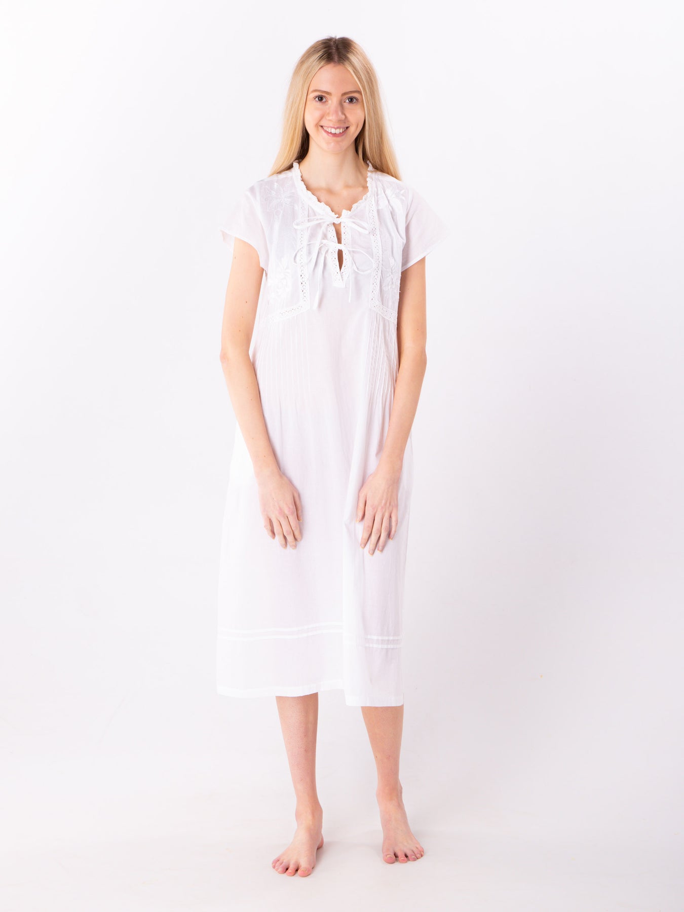 Beautiful short sleeved nightdress in a mid length, featuring a lace frilled neckline, and ribbon front opening. The hand stitched pin tucking and embroidery add a touch of elegance.