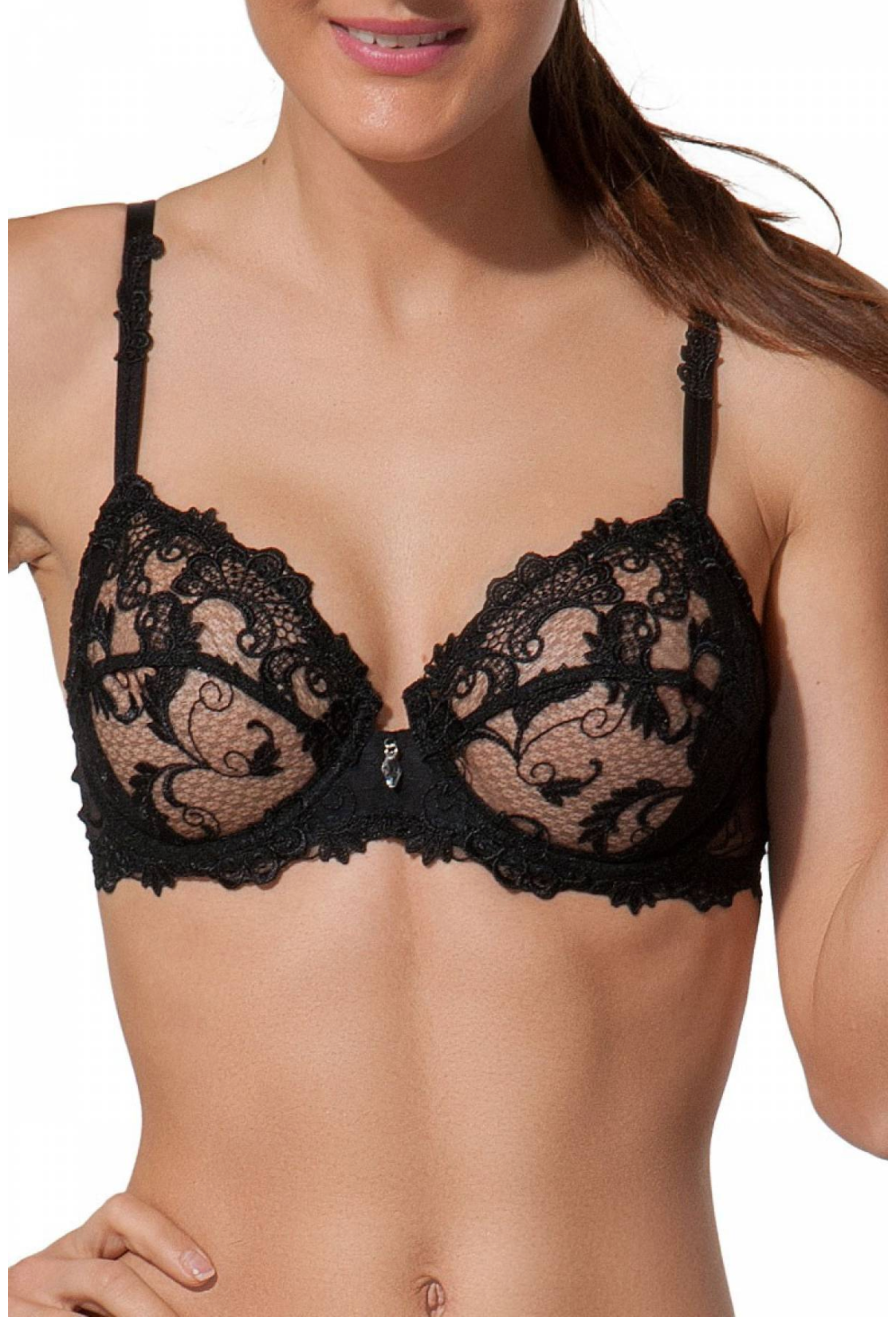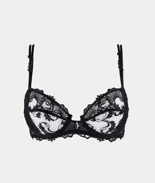 Underwired smooth bra. This bra offers a natural fit and comfort. Full cups design. The spaghettis straps are thin and adjustable for more lightness and feminity. Guipure yokes for tatoo effect on the cups and at the back panel. Refined Swarovski necklet as a finishing touch.