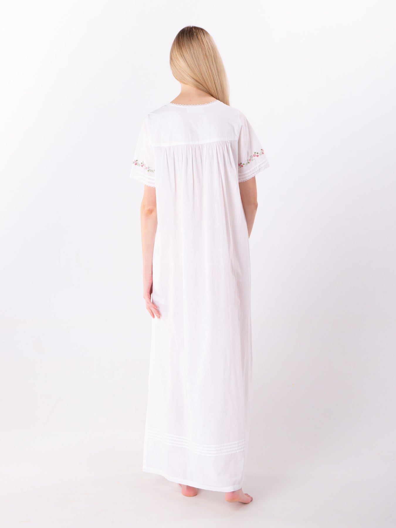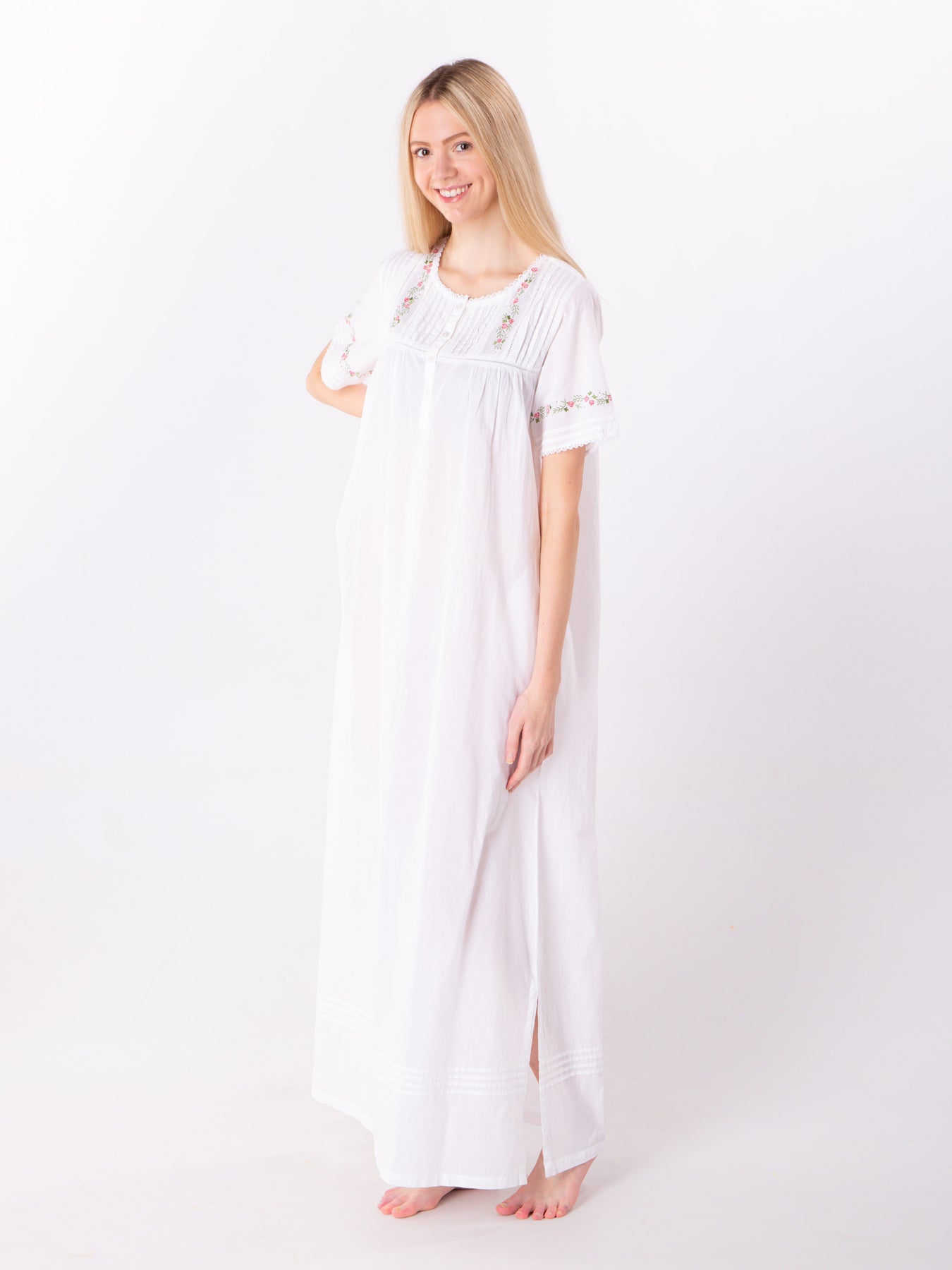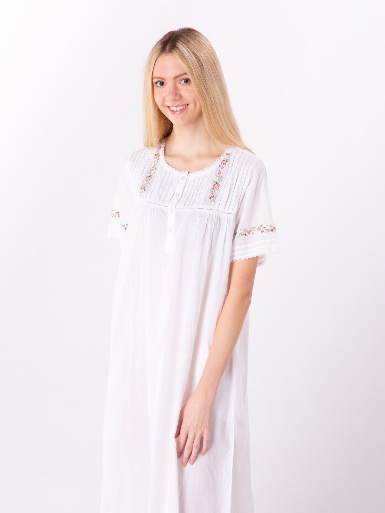 Stunning white nightdress in a short sleeve. This square neck features a front button opening with a lovely pintucking and embroidery on either side.