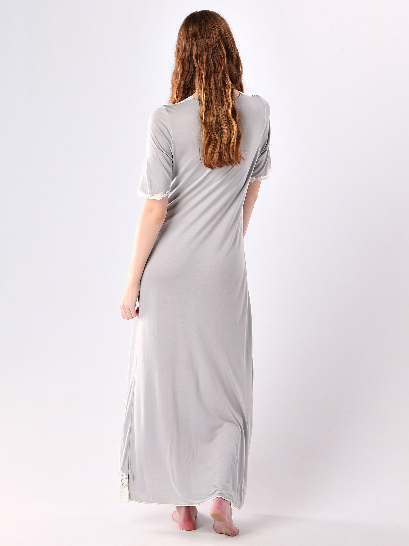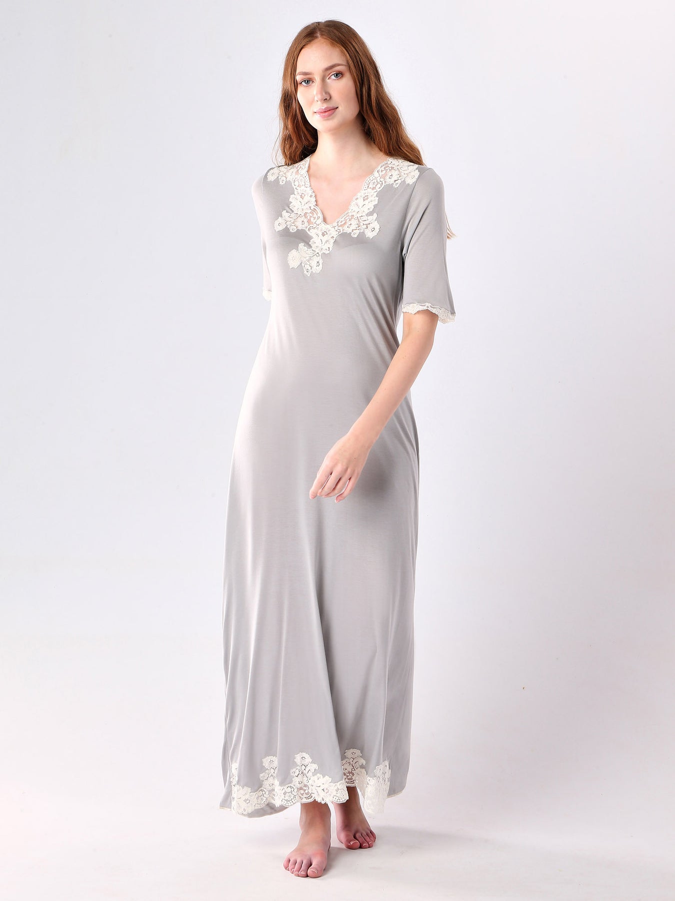 Stunning short sleeve stretch nightdress in a luxury Italian modal fabric. This designer nightgown boasts a beautiful french lace along the neckline and arms. This is part of our Bridal collection.