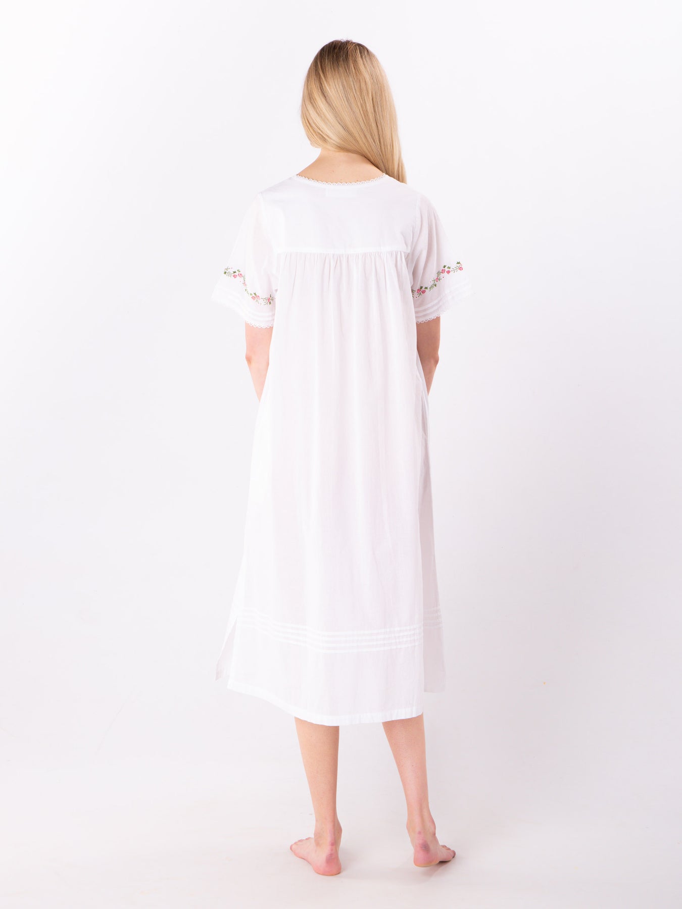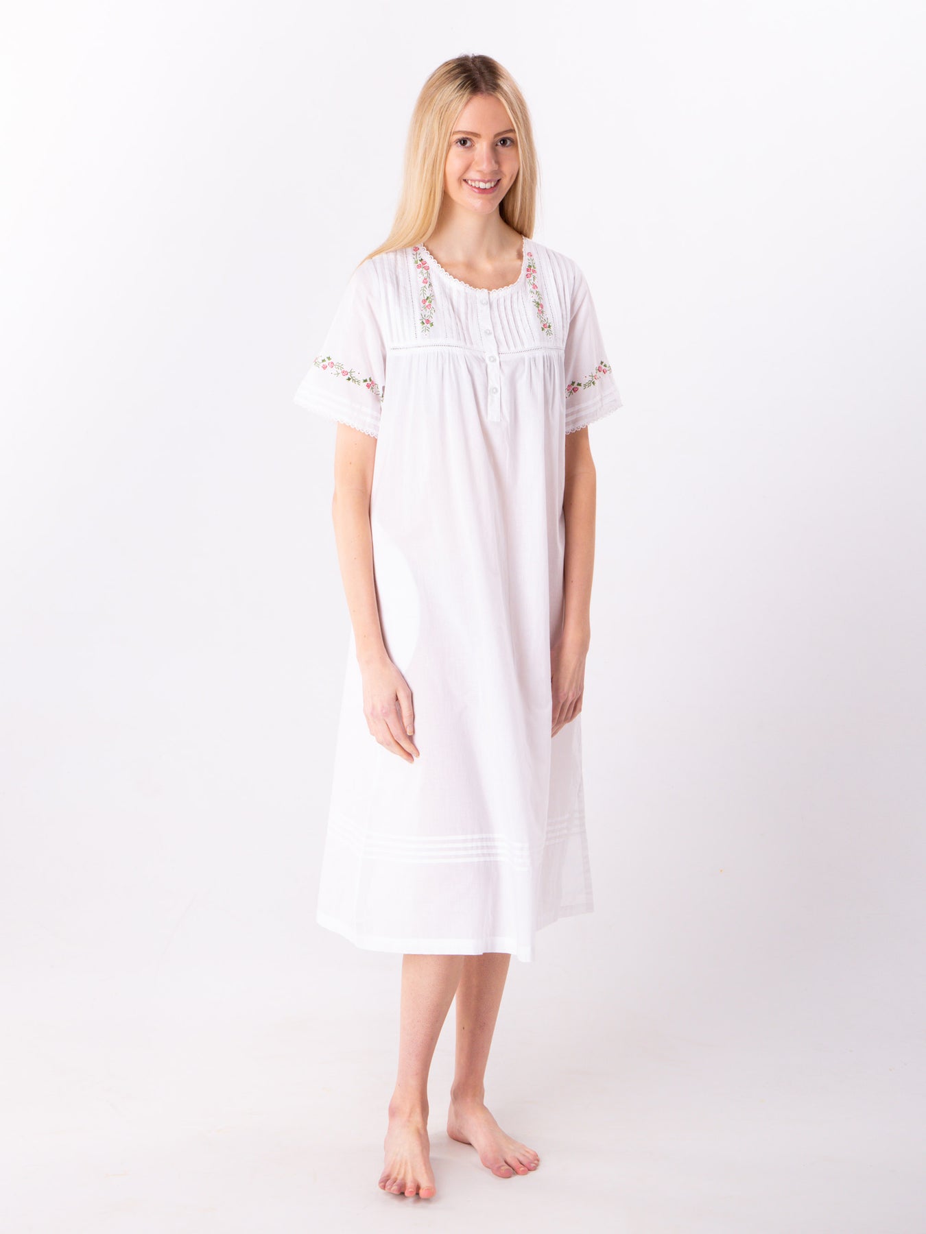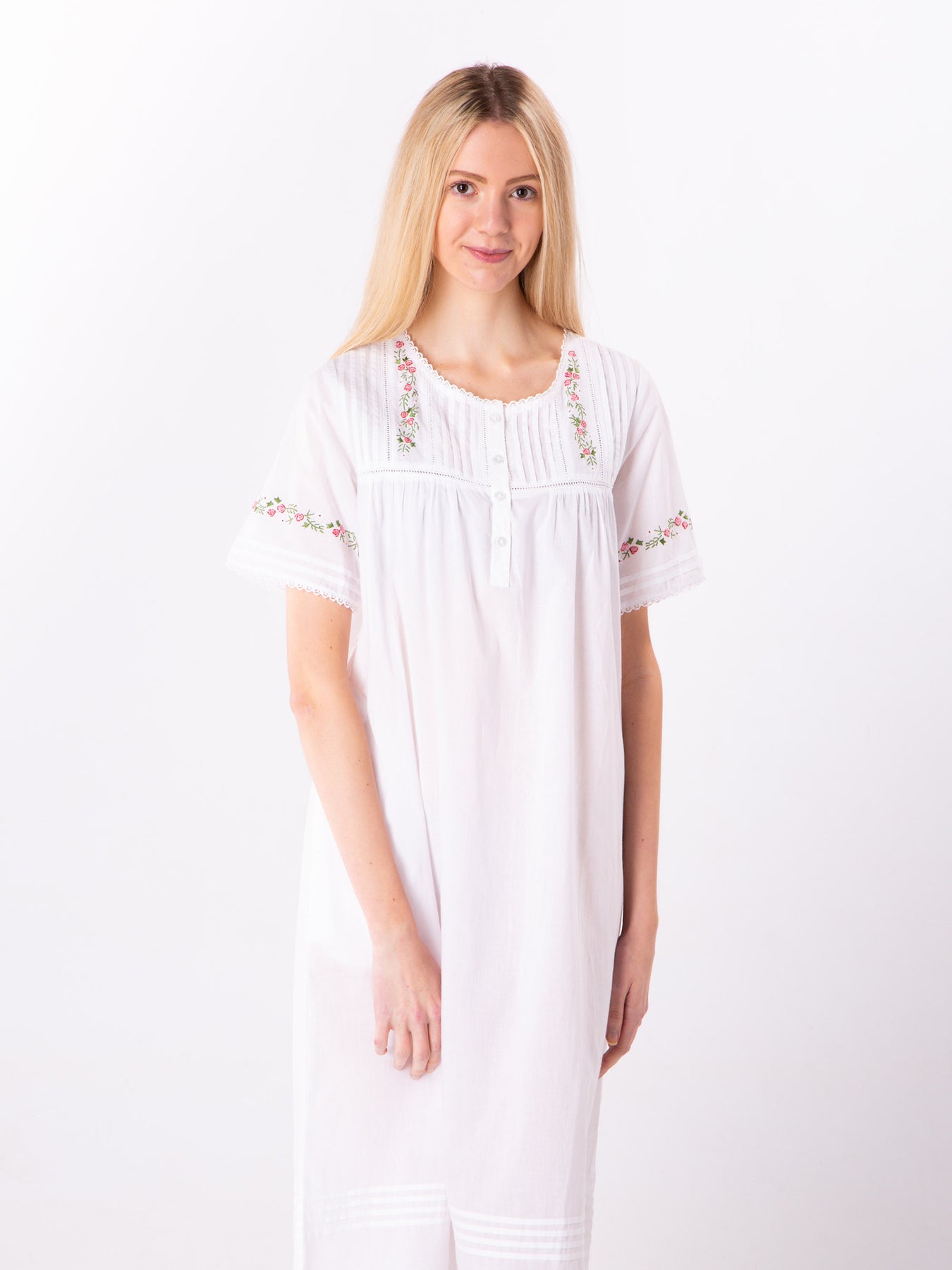 Beautiful sleeveless nightgown featuring a frilled collar. The embroidered pin tucks add a wow factor. Features a front opening with 4 buttons.