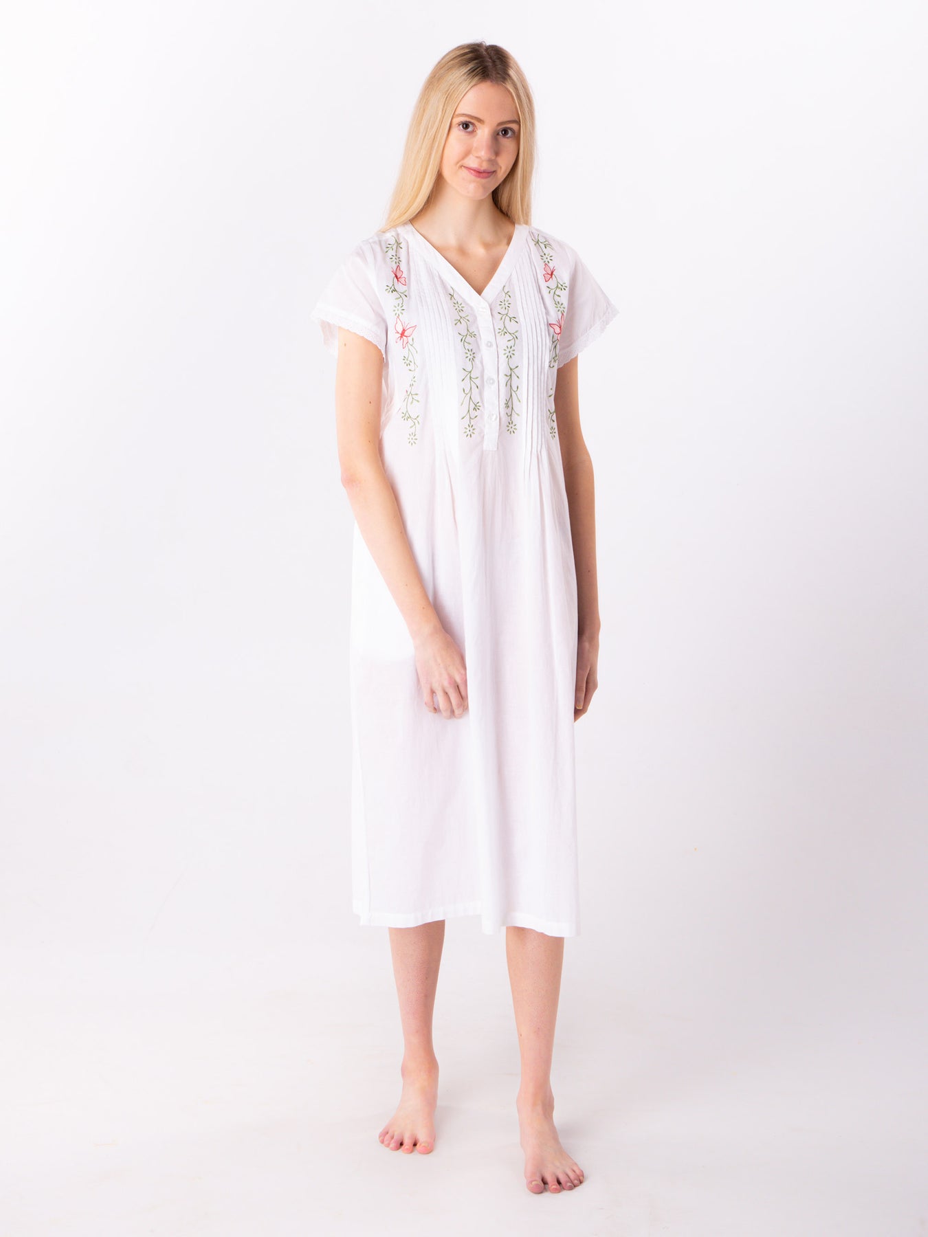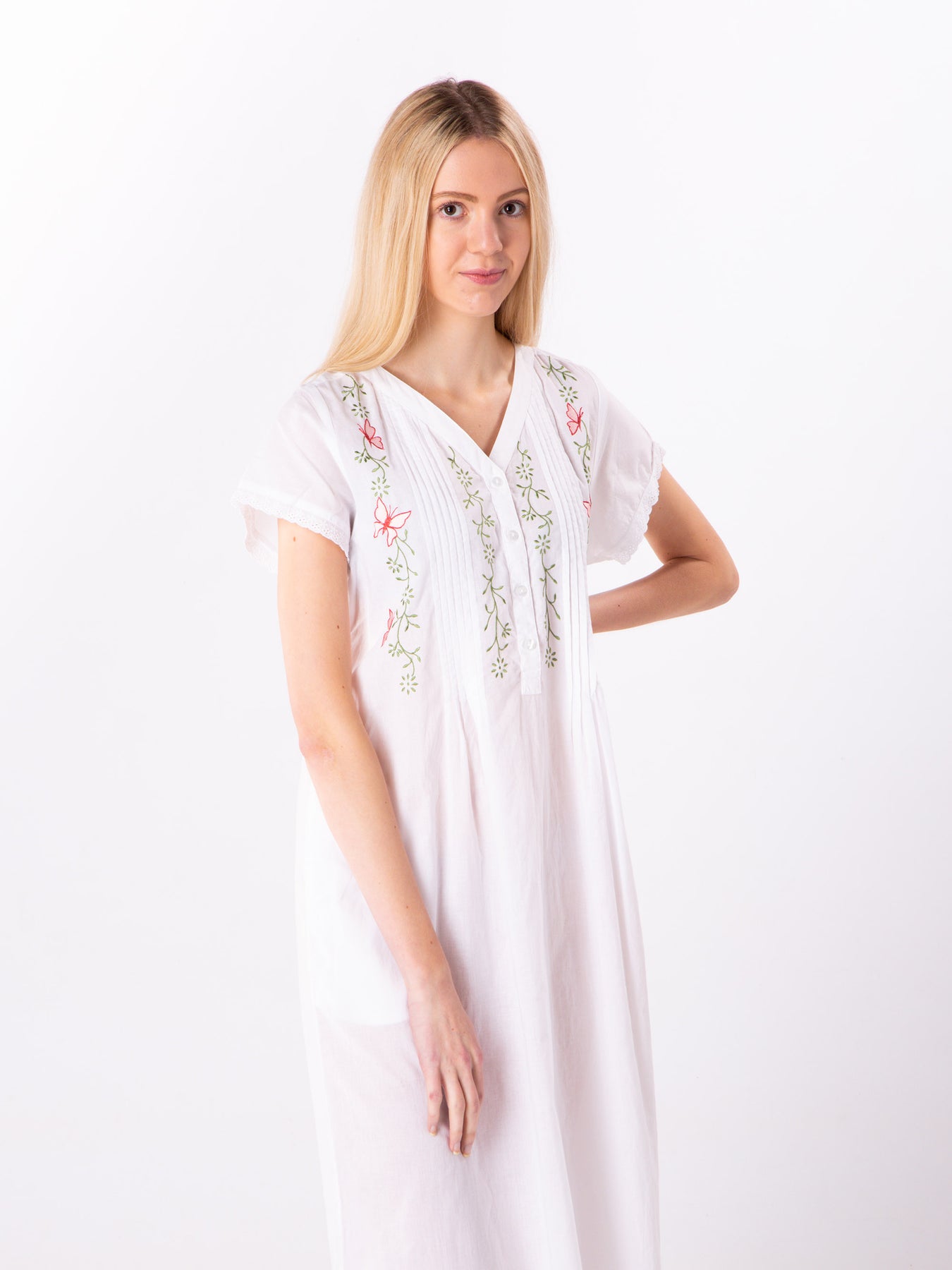 Beautiful sleeveless nightgown featuring a frilled collar. The embroidered pin tucks add a wow factor. Features a front opening with 4 buttons.