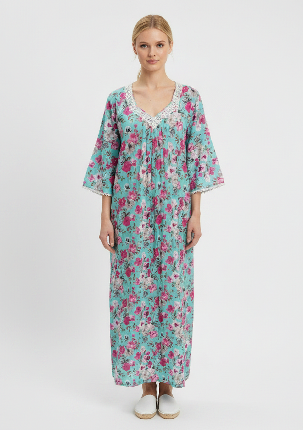 Drift into effortless comfort with the Blossom Breeze Maxi Nightdress, designed for relaxed elegance and all-night ease. Crafted from a lightweight, breathable fabric, this full-length nightdress features a soft turquoise base adorned with delicate pink floral prints that bring a fresh, calming aesthetic. The loose, flowy silhouette allows for unrestricted movement, while the wide sleeves and gentle gathers add to its airy feel. A subtly embellished V-neckline introduces a touch of femininity and refinement, making it as beautiful as it is comfortable. Perfect for warm nights or leisurely mornings, this piece blends style and comfort into a timeless sleepwear essential.