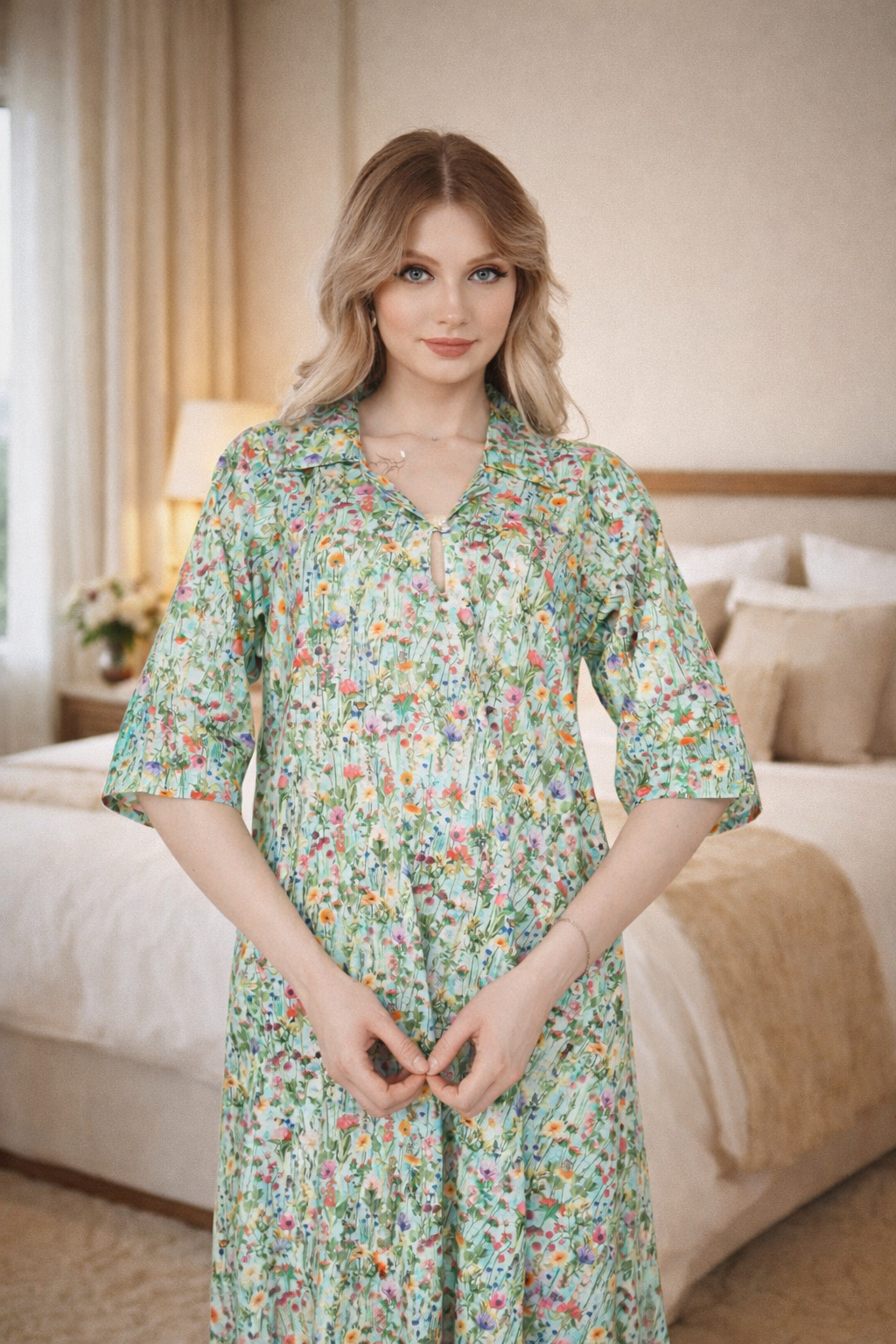 A fresh, feminine Kolos dress designed for effortless everyday wear. Crafted in a lightweight fabric, this piece features a soft mint green base scattered with delicate multicolour floral motifs, creating a bright and uplifting look.